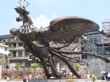 對(duì)古城的另一種破壞是“新景觀”。目前在新舊城的接壤處正在建一個(gè)廣場,現(xiàn)代化的水泥柱正拔地而起,一座用黃銅鑄造的“鳳凰雕塑”挺立在廣場的中央。遺憾的是,此“鳳凰”(見圖片)造型完全打破了人們對(duì)這只吉祥鳥的美好想像。正如來自上海和香港的游客所形容看過后的感受,像一只“落湯雞”,完全不能與古城相匹配。