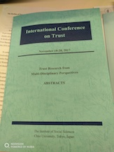 跨學(xué)科視野中的誠信研究 ——日本“國際誠信大會”紀(jì)要 國際誠信大會于2017年11月18日-20日在日本中央大學(xué)召開。大會主題關(guān)于“跨學(xué)科的誠信研究”。來自世界幾十個國家的150余位代表出席了會議,且絕大多數(shù)代表來自歐美,亞洲學(xué)者占比很小。 會議手冊 開幕式上的大會主題演講是荷蘭蒂爾堡大學(xué)經(jīng)濟(jì)和商業(yè)管理學(xué)院Bart Nooteboom資深教授通過視頻主講了“不確定性和經(jīng)濟(jì)需求行為中的信任”。他的核心思想:誠信雖然是道德和倫理層面的問題,但卻對社會秩序、人與人的關(guān)系產(chǎn)生深刻影響。公平、公正、合理的價值體系是維護(hù)誠信的最好保障。當(dāng)前整個世界處于高度的不確定性中,經(jīng)濟(jì)貿(mào)易系統(tǒng)錯綜復(fù)雜。探討誠信十分必要。 美國佩斯大學(xué)藝術(shù)與科學(xué)學(xué)院Roger A. Salerno講授主講“社會學(xué)視角的當(dāng)代誠信觀”。 德國萊恩哈德·摩恩管理學(xué)院管理總監(jiān)Guido M?llering:“脆弱性:誠信研究的致命弱點(diǎn)”。 英國基爾大學(xué)心理學(xué)院Ken J. Rotenberg:“人際信任與調(diào)適的關(guān)系”。 荷蘭蒂爾堡大學(xué)經(jīng)濟(jì)學(xué)院管理部Henk Akkermans:“誠信:供應(yīng)網(wǎng)絡(luò)中突現(xiàn)的社會形態(tài)現(xiàn)象”。 美國密蘇里中央大學(xué)國際事務(wù)學(xué)院院長Joseph D. Lewandowski “體育運(yùn)動、誠信和社會資本”。 德國奧托·馮·格里克大學(xué)社會學(xué)和宏觀社會學(xué)系教授Jan Delhey:“社會經(jīng)濟(jì)現(xiàn)代化和誠信:以中國為例”。 布拉格查爾斯特大學(xué)社會學(xué)系étasedlá?Ková教授:“誠信:公民民主參與的合法性——1989后過渡時期的捷克共和國”。 荷蘭格羅寧根大學(xué)經(jīng)濟(jì)與商業(yè)學(xué)院Katinkabijlsma Frankema:“人際信任:一種動態(tài)的方法”。 香港大學(xué)社會學(xué)系主任Eric Fong:“從亞洲視角看中國的誠信”。 美國賓州大學(xué)政治學(xué)系Donna Bahry教授與俄羅斯科學(xué)院科學(xué)社會政策中心,莫斯科國家研究大學(xué)高等經(jīng)濟(jì)學(xué)院Forlongitudinal:“誠信與變革:以俄羅斯為例”。 北愛爾蘭阿爾斯特大學(xué)心理健康和福祉中心主任Gerard Leavey:“誠信在精神衛(wèi)生和心理健康服務(wù)中的意義——英國的視角”。 俄羅斯科學(xué)院人文科學(xué)與社會學(xué)研究所Zhan Toshchenko:“公眾誠信的新視角”。 另有若干主題發(fā)言,學(xué)者們分別從不同學(xué)科對“誠信”問題做出探討,包括哲學(xué)、政治學(xué)、行為學(xué)、心理學(xué)、社會學(xué)、文化學(xué)等學(xué)科。 將“誠信”作為一個認(rèn)知領(lǐng)域,并學(xué)術(shù)化十分鮮見,但在現(xiàn)實(shí)世界,誠信是那么地重要。 誠信在中國是五常之基(仁義禮智信)。“誠者,圣人之本。大哉干元,萬物資始,誠之源也。” 誠信本質(zhì)上是人的道德倫理現(xiàn)象,具有普遍性與普適性;其目的是維系一個有序、可續(xù)、友善、虔敬和高效的人間與社會倫理關(guān)系。誠信,之于個人是立足社會的圭臬;之于社會是保持和諧和促進(jìn)人民福祉的標(biāo)尺。因此被儒家以“四教”(文、行、忠、信)而規(guī)范之。 但是,反觀現(xiàn)實(shí),誠信在人們的現(xiàn)實(shí)生活中幾乎喪失殆盡,令人唏噓。誠信何以發(fā)生?何以運(yùn)行?何以肢解?何以破碎?帶著這些問題筆者至?xí)⑻峤灰黄撐木V要:“尋蹤儒家道德體系中的誠信”,以求教于大家。 日本主辦的會議歷來簡約、簡樸、簡潔,雖無更多人、才、物的投入,但會議質(zhì)量卻不低。中央大學(xué)社會科學(xué)系榮譽(yù)教授佐佐木政通在整個會籌備過程,基本傾一人之力,卻邀來150名賓客。招待會雖簡約,卻能體現(xiàn)主人的熱誠與隆重——五位志愿者以擊鼓表演表達(dá)了對諸位嘉賓的熱誠歡迎。表演者中年長者72歲,兩位66歲,兩位20余歲。他們的表演激情四射、朝氣蓬勃。合著諸位觀者有節(jié)奏的掌聲,使表演高潮迭起。日本人的儀式感無處不在。儀式感是體面與尊嚴(yán)生活的組成部分,是文化的火花,是歷史的蝴蝶結(jié),是生命的告白。沒有儀式與儀式感何談生活、文化認(rèn)同?! 招待會表演