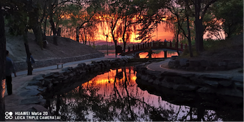 圖片6 ,2019年5月22日,第247次北京園林徒步。圓明園里霞滿天 ,遠(yuǎn)處“借景”可以看到北京的西山,與紐約的中央公園可形成鮮明對(duì)比(楊虛杰攝影)